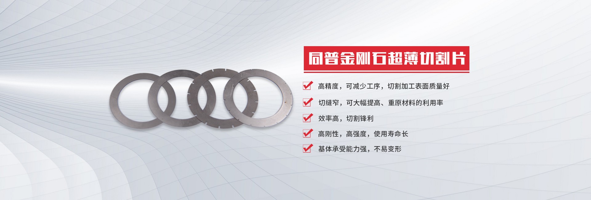 公司研發(fā)并生產(chǎn)的超薄型金剛石砂輪切割片,主要應(yīng)用于電子工業(yè)領(lǐng)域?qū)Ω鞣N非金屬硬脆材料進(jìn)行切割或開槽加工,如硅、鍺、磷化鎵、砷化鎵、磷砷化鎵、鐵氧體、鈮酸鋰、鉭酸鋰、壓電陶瓷、光學(xué)陶瓷、玻璃等。其產(chǎn)品具有割縫窄、精度高、壽命長(zhǎng)等特點(diǎn)。